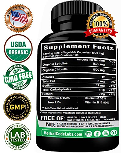 Chlorella Spirulina Powder Capsules Organic – 3000 mg of BMAA Free Purest Blue Green Algae – Best Raw Vegan Protein Green Superfood Broken Cell Wall – Made in USA