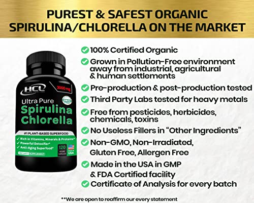 - We are the SAFEST ORGANIC CHLORELLA SPIRULINA CAPSULES – Our Certificates of Analyses and constant pre & post-production testing confirm that WE CARE of YOU. We use only Verified Source for procurement of spirulina powder & chlorella powder to ensure that every batch of SuperGreens is consistent with respect to quality & purity. Produced in compliance with the best in industry standards and have International Organic Certifications.