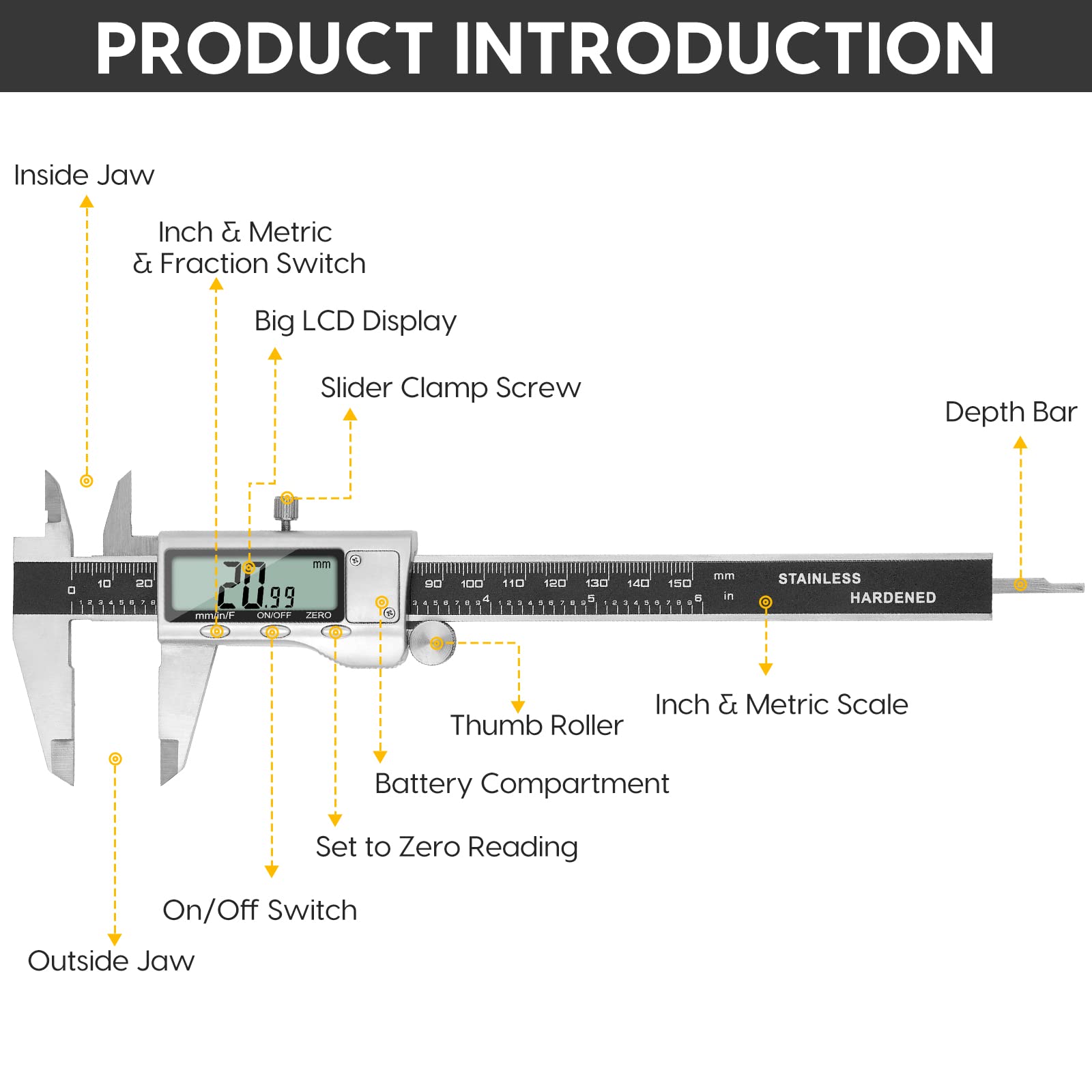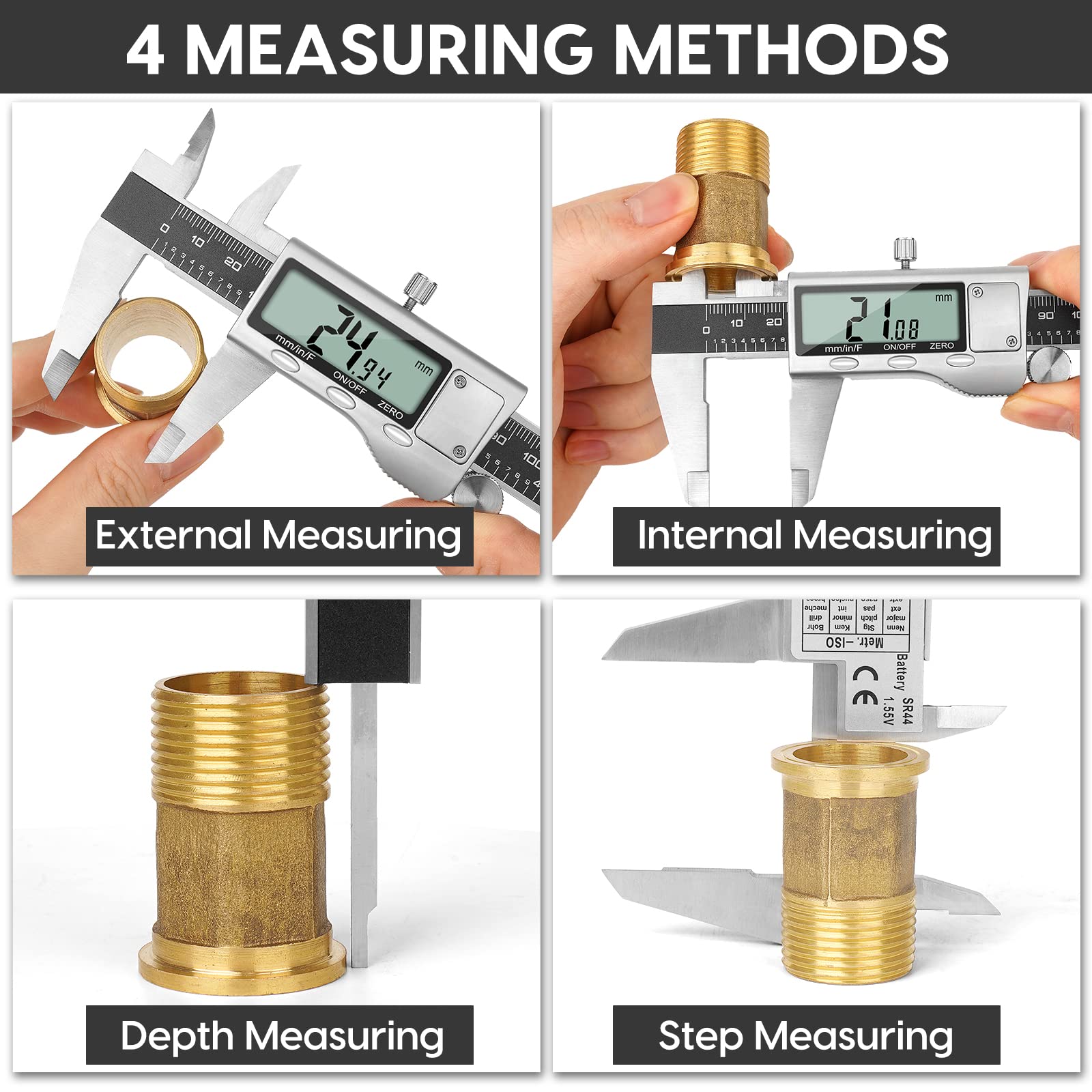 - 【4 MEASUREMENT MODES】The caliper tool has 4 measurement modes, which can be used to measure inside and outside diameter, depth and step with two sets of jaws and a probe. Multiple measurement modes can bring more usage scenarios to people, and the measurement process is also very convenient.